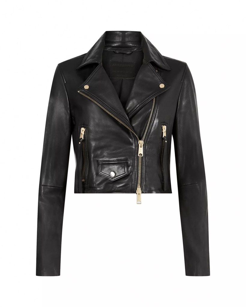 ALLSAINTS Elora Cropped Slim Leather Biker Jacket My husband bought me this jacket for Christmas a couple of years ago, and it’s amazing! It’s super soft and not bulky like most biker jackets. The cropped style is perfect for my wide hips and smaller waist. It’s a splurge, but it will last forever!